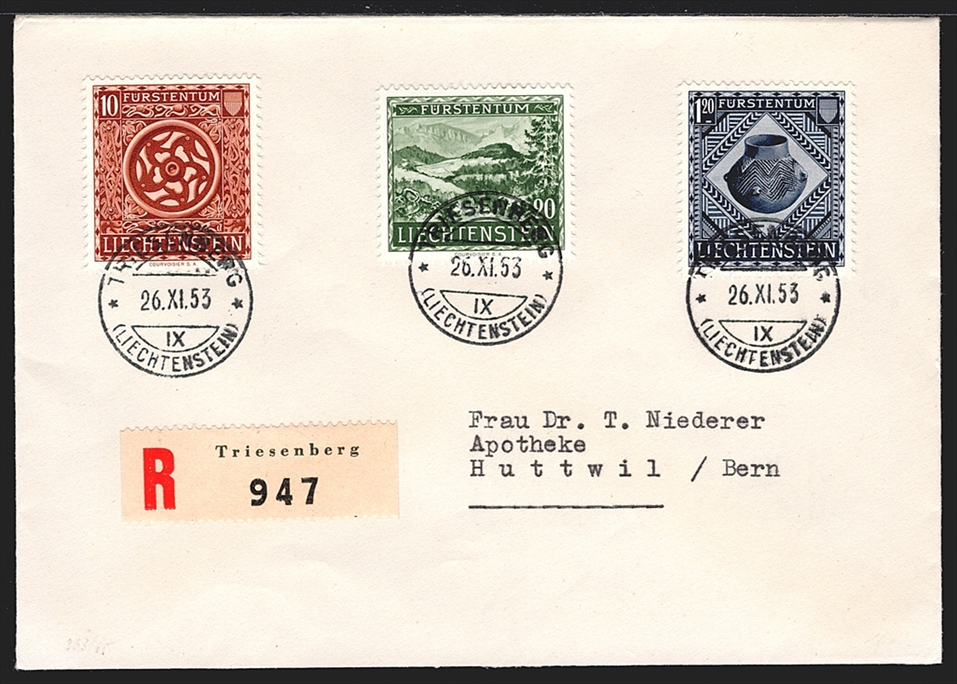 Liechtenstein, FDC, Freimarken, Prähistorische Funde, Nr.263-265, komplette Serie, gestempelt TRIESENBERG, R-FDC nach Huttwil