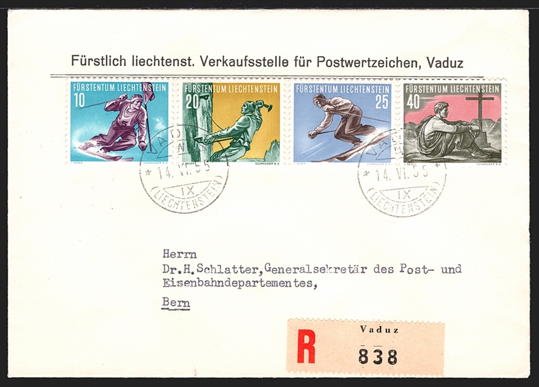 Liechtenstein, FDC, Freimarken, Sport, Nr.278-281, komplette Serie, gestempelt VADUZ, R-FDC nach Bern