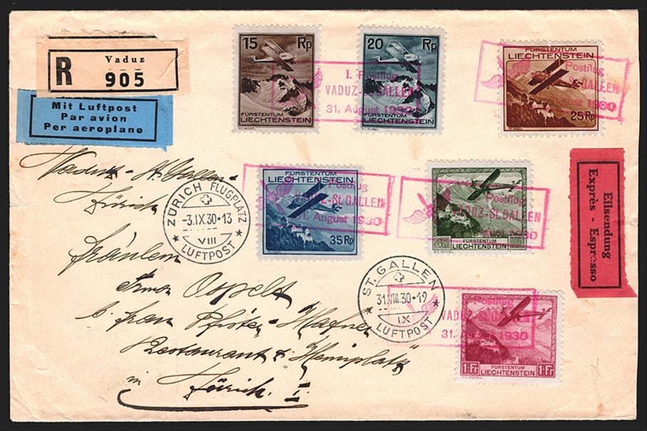 Liechtenstein, Flugpost, Nr.1-6, komplette Serie, auf R-Express Flugbrief Vaduz-St.Gallen, SF 30.5b, leichte Reisespuren