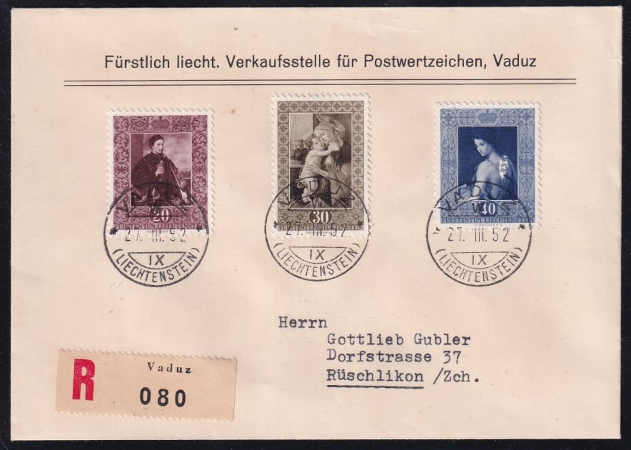 Liechtenstein Freimarken 1952, Gemälde, Nr. 250-52, offiz. R-Umschlag