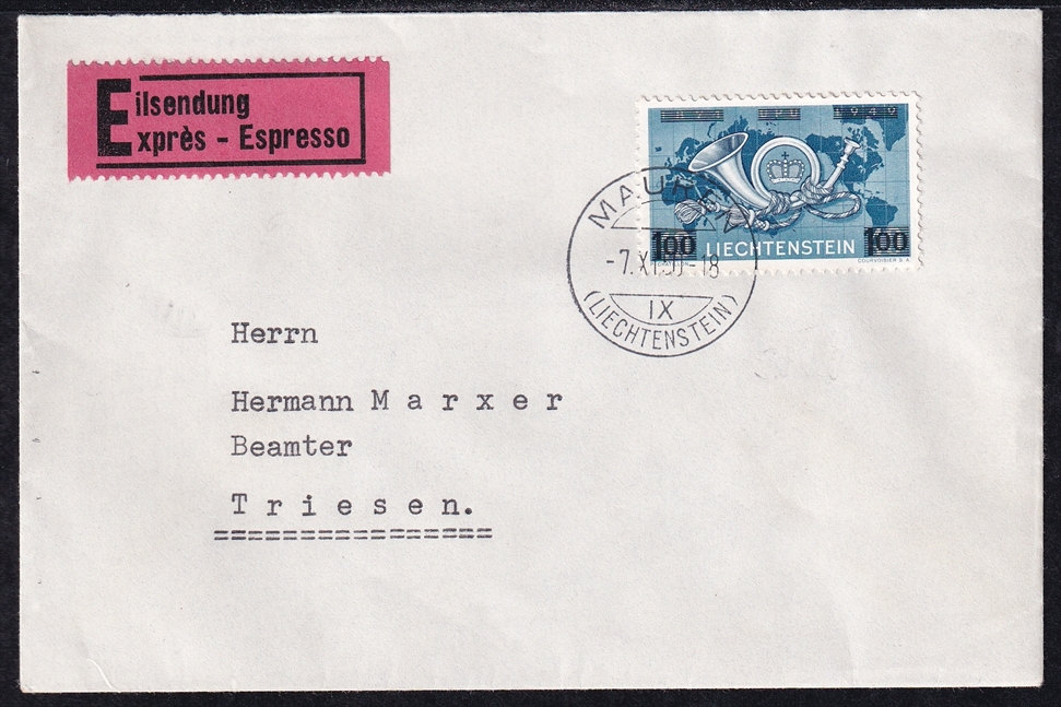 Liechtenstein, Freimarken, FDC, Nr.288, auf Express-FDC nach Triesen