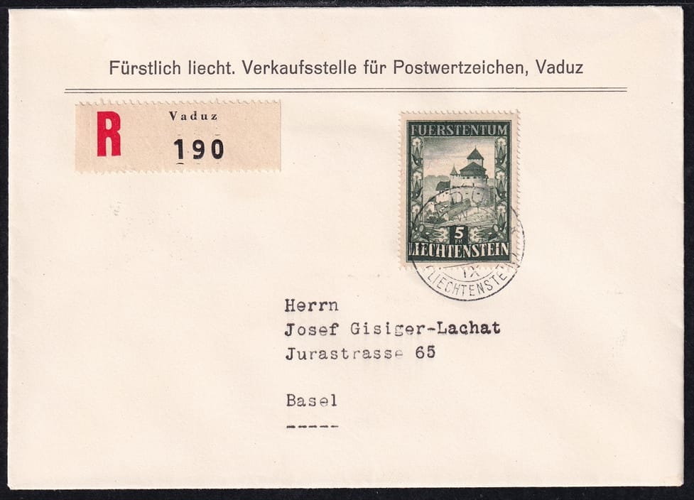 Liechtenstein, Freimarken, FDC, Nr.309, R-FDC der Verschleissstelle Vaduz nach Basel