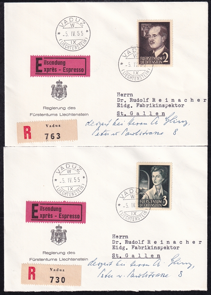 Liechtenstein, Freimarken, FDC, Nr.332-333, auf 2 FDC der Verschleissstelle Vaduz nach St.Gallen