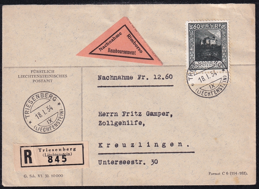 Liechtenstein, Freimarken, Nr.103, sauber gestempelt TRIESENBERG, Nachnahme nach Kreuzlingen