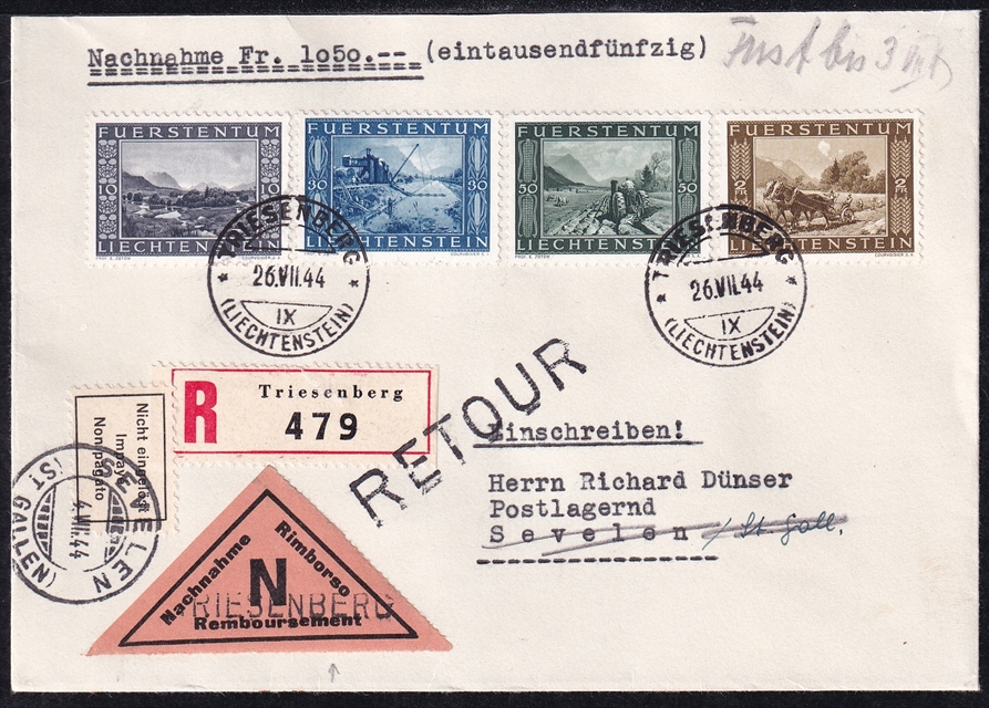 Liechtenstein, Freimarken, Nr.218-221, Satzbrief, nicht eingelöste Nachnahme nach Sevelen, sauber gestempelt TRIESENBERG