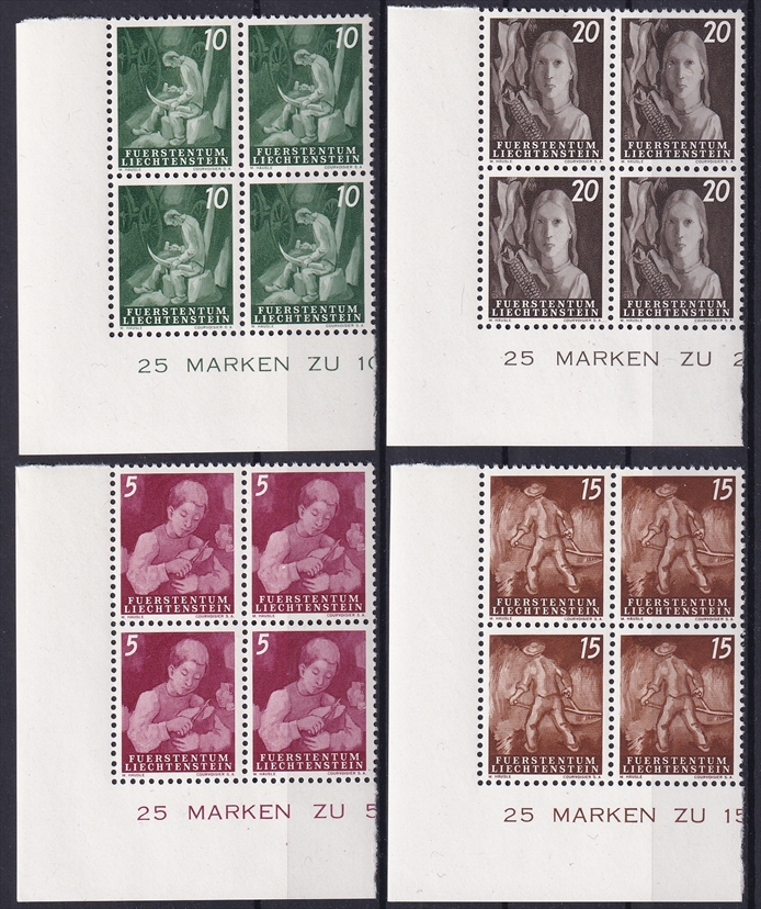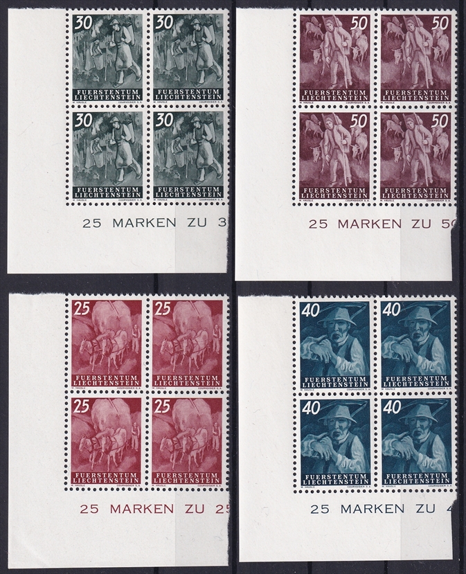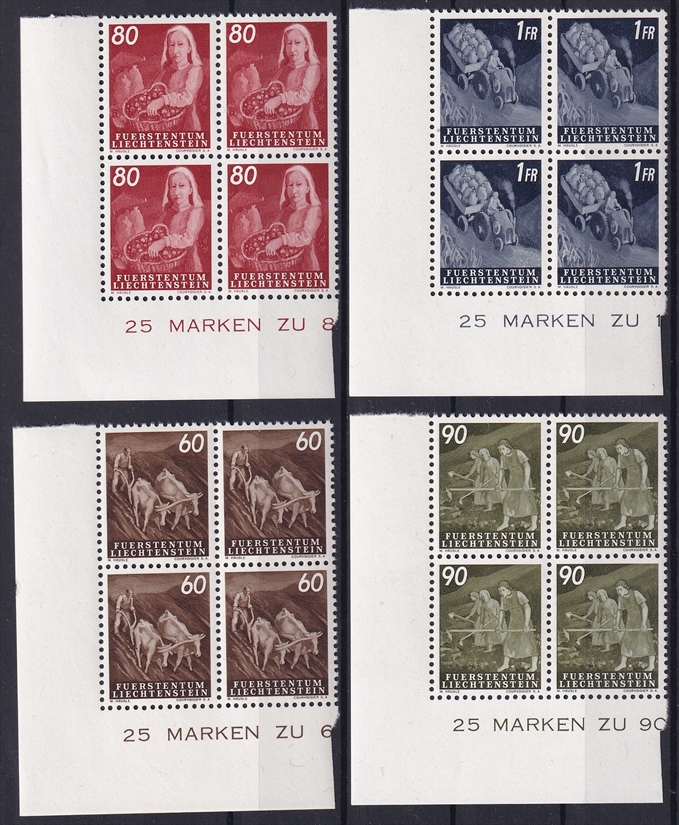 Liechtenstein, Freimarken, Nr.289-300, Feldarbeit, Viererblöcke mit Bogenecken