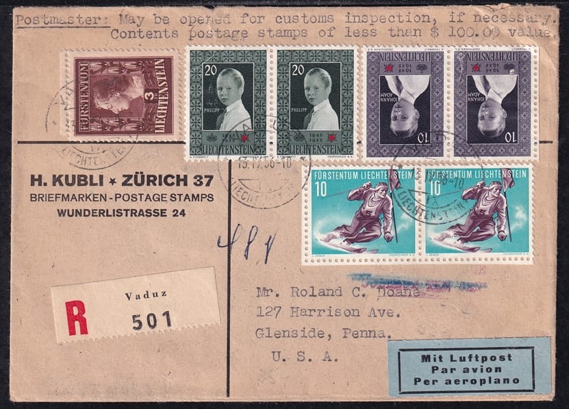 Liechtenstein, Freimarken, Nr.305A+, R-Bedarfsflugbrief über 46gr. nach USA, sauber gestempelt VADUZ, Beleg kleine Reisespuren