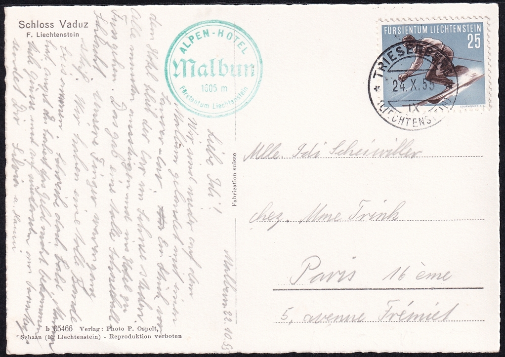 Liechtenstein, Freimarken, Nr.336, Sport, auf Karte nach Paris, sauber gestempelt TRIESENBERG