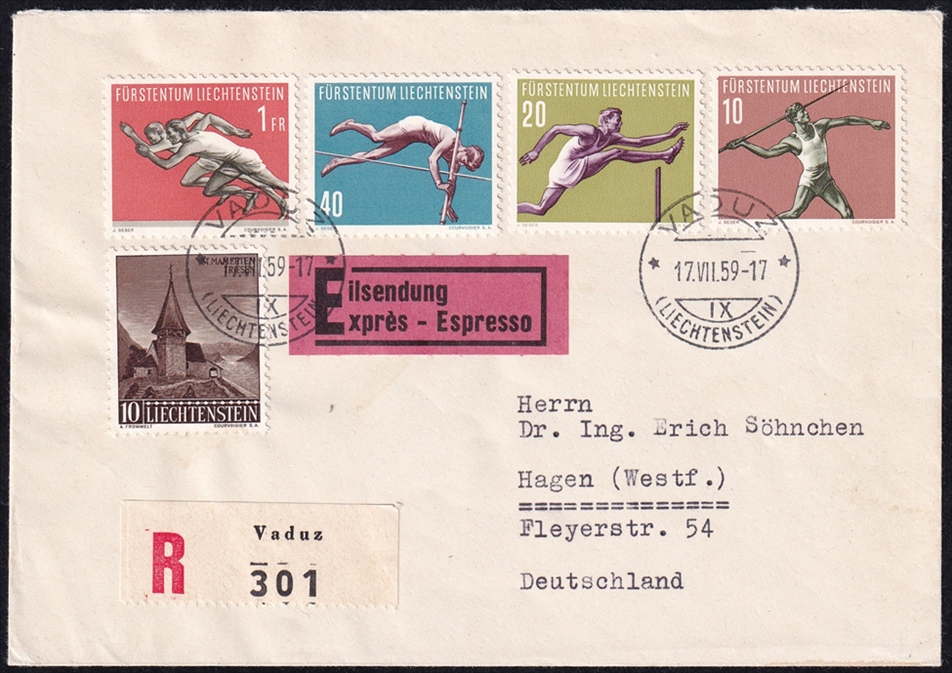 Liechtenstein, Freimarken, Nr.342-345+, Sportserie mit Zusatzfrankatur nach Hagen, sauber gestempelt VADUZ