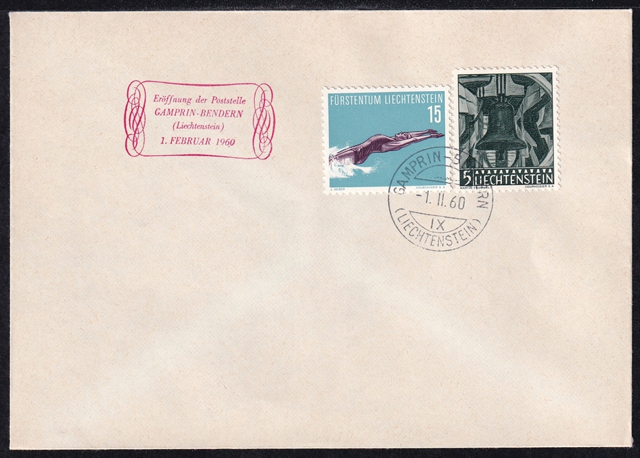 Liechtenstein, Freimarken, Nr.365/374, Zusatzstempel zur Eröffnung der Postestelle GAMPRIN-BENDERN, unadressierter Umschlag