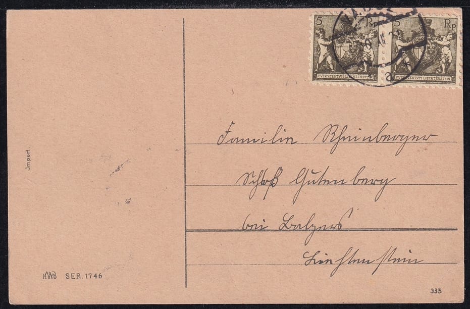 Liechtenstein, Freimarken, Nr.48A, im Paar auf Kitschkarte, sauber gestempelt VADUZ