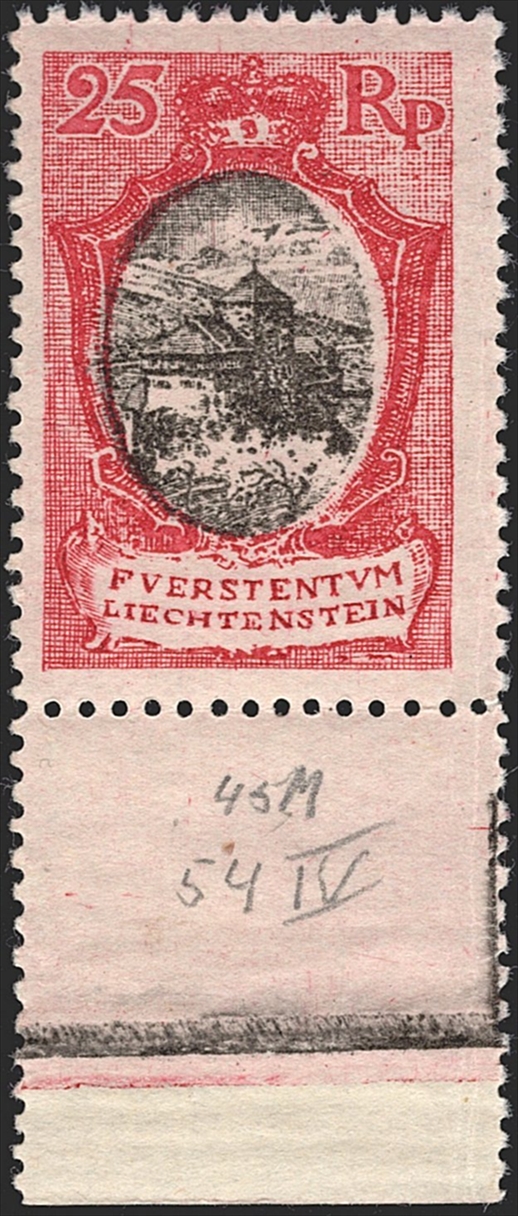 Liechtenstein, Freimarken, Nr.54 PF III, 25Rp.dunkelrot, Inschrift und Hintergrund retouchiert, 45.Marke