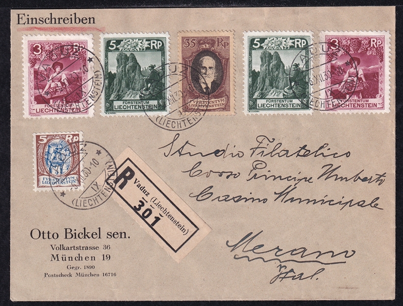 Liechtenstein, Freimarken, Nr.56/94 II, sauber gestempelt VADUZ, Brief nach Meran, Nr.94 II „weisser Fleck in der Randlinie“