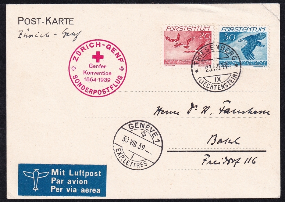 Liechtenstein, Luftpost, Freimarken Nr.175/176 auf Rotkreuzflug Zürich-Genf, 89b, sauber gestempelt TRIESENBERG