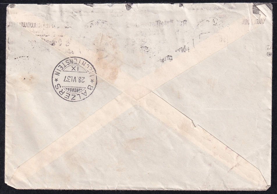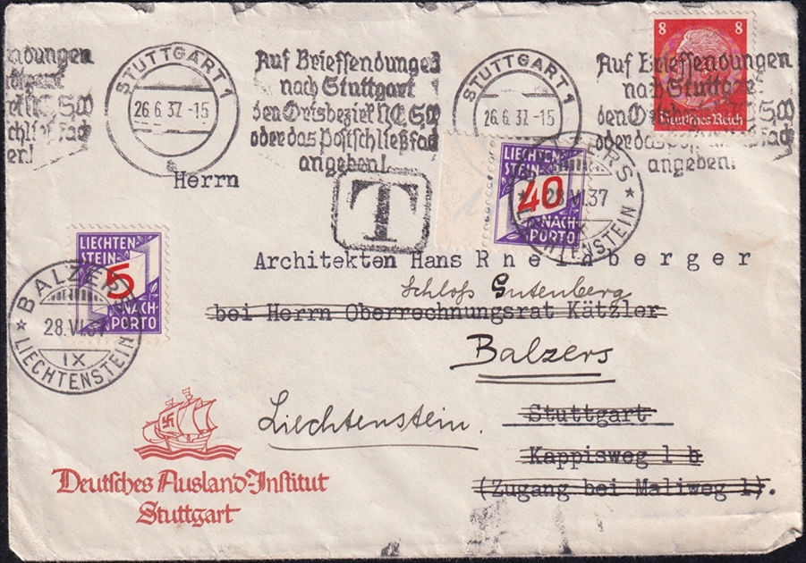 Liechtenstein, Nachporto, Nr.13/19, auf umadressiertem Brief aus Stuttgart, BALZERS