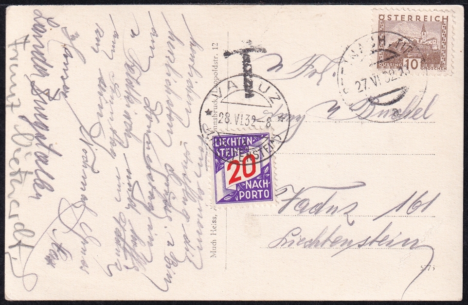 Liechtenstein, Nachporto, Nr.14, auf Ansichtskarte aus Steinach, sauber gestempelt VADUZ