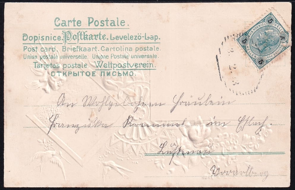 Lithokarten um 1900 – „Blumen, Rosen, Schwalbe“ – gestempelt