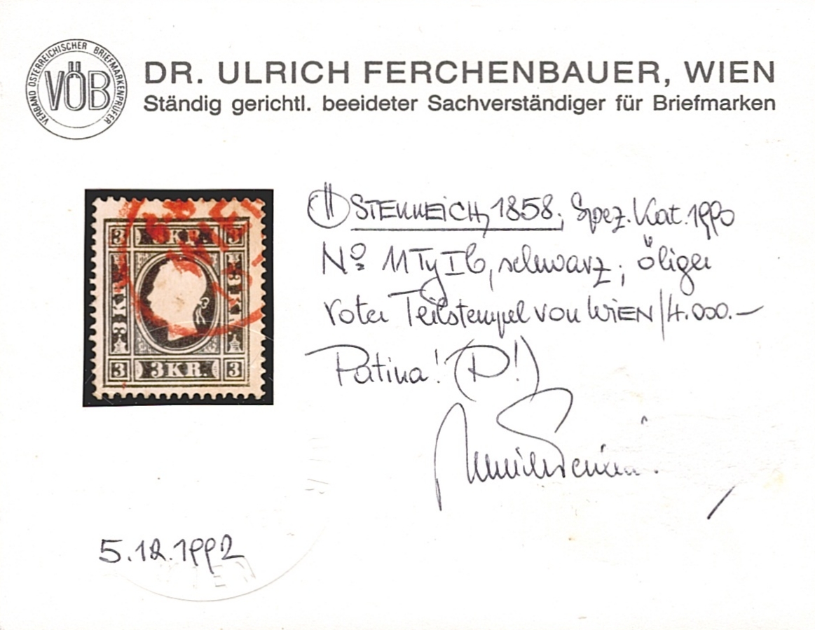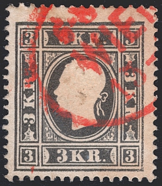 Österreich 1858 3 Kreuzer ANK Nr. 11 Ib „schwarz“ mit rotem Stempel WIEN