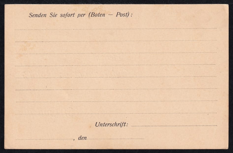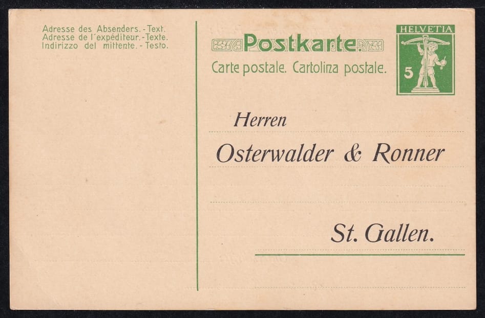 Schweiz 1910, Ganzsachen Postkarte 5 Rp. Typ III Zudruck „Osterwalder & Ronner“ Schriftlänge 6.9 cm