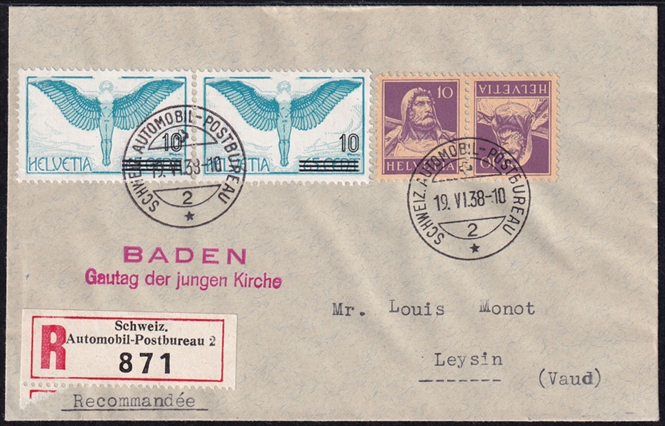 Schweiz 1938 Kehrdruck SBK Nr. K24 auf R-Brief mit Zusatzfrankatur „Automobilpost“