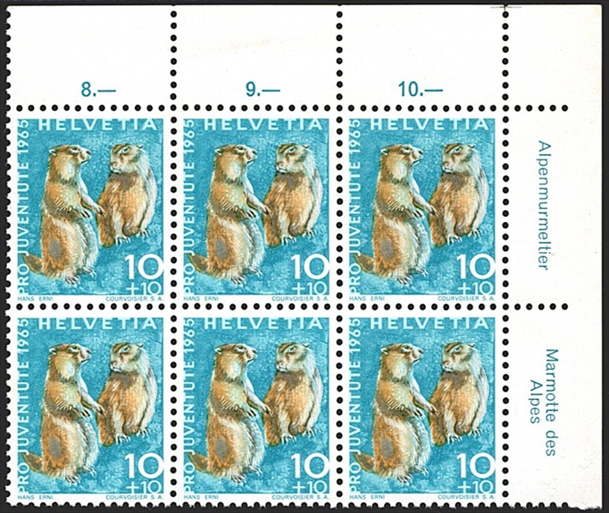 Schweiz, Abarten, Pro Juventute, Nr.211.3.01, Retouche an der 1 von 1965, 6er-Block