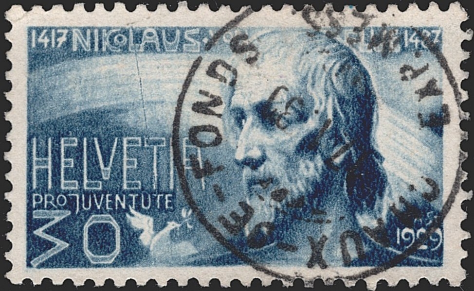 Shop » Schweiz, Abarten, Pro Juventute, Nr.44.2.01, blauer Strich von NIKOLAUS bis HELVETIA, gestempelt CHAUX-DE-FOND