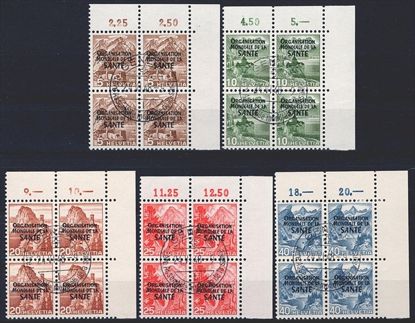 Schweiz, Ämter, OMS 1-5, 1948, Landschaftsbilder, im Viererblock, Ersttag Stempel