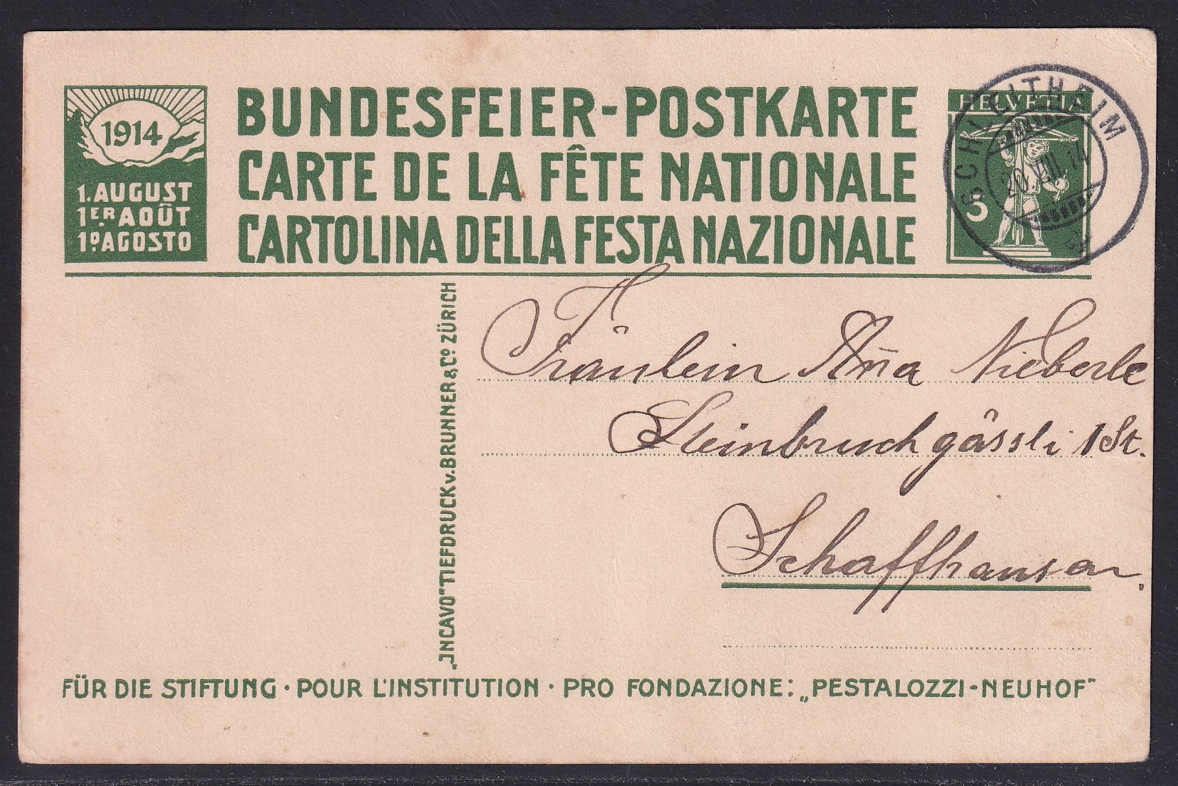 Bundesfeierkarte 1914 Nr. 10 „Pestalozzi und sein Enkel“ gestempelt