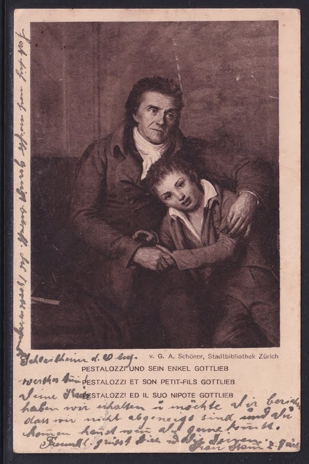 Schweiz Bundesfeierkarte 1914 Nr. 10 „Pestalozzi und sein Enkel“ gestempelt