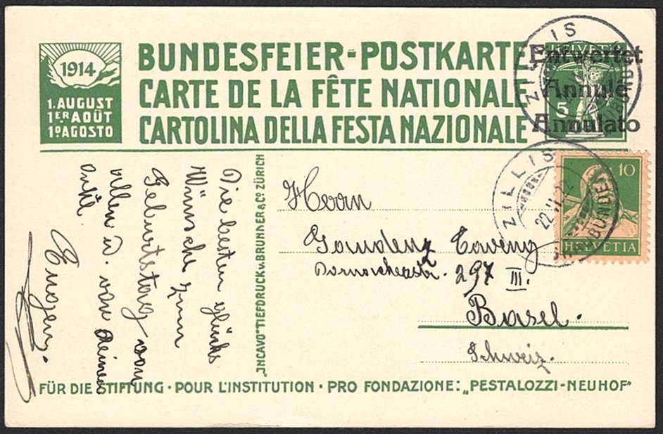 Schweiz, Bundesfeierkarten, 1911, Nr.11, Pestalozzis Gattin, „ENTWERTET“, mit Nr.153, gestempelt ZILLIS