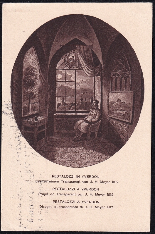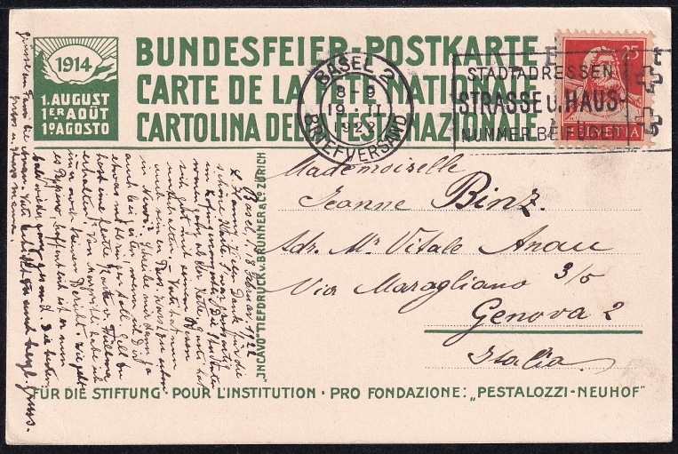 Schweiz Bundesfeierkarten 1914, Pestalozzi in Yverdon, Nr. 9 mit Frankatur Z-Nr. 155 nach Genova
