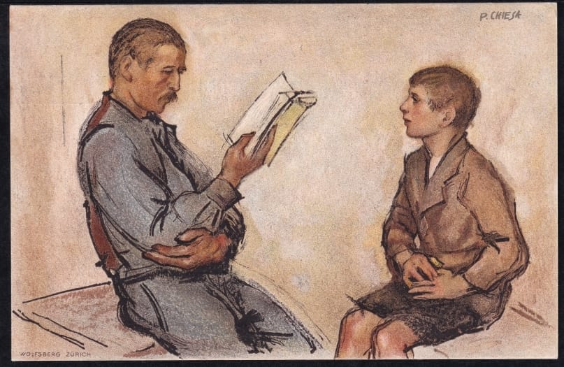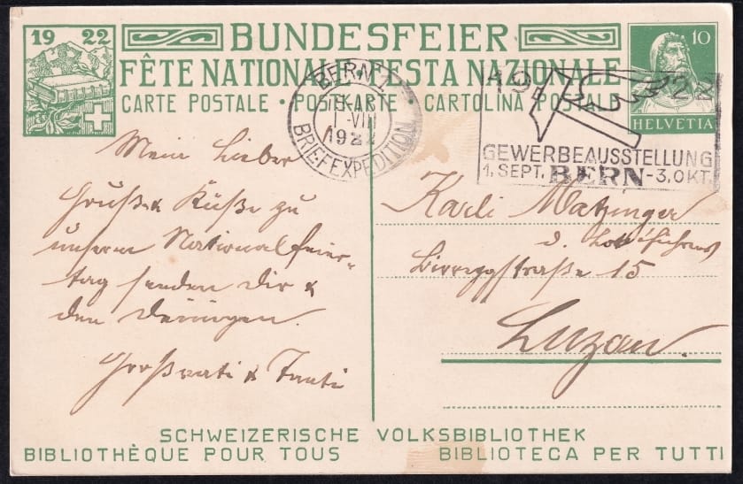 Schweiz Bundesfeierkarten 1922, Vater mit Sohn, 10 Rp., Künstlerunterschrift Chiesa ist fett, gestempelt 1.8.