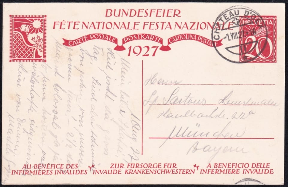 Schweiz Bundesfeierkarten 1927, Krankenschwester, Wertzeichenaufdruck 20Rp.rot, gestempelt CHATEAU D OEX 1.VIII, nach München