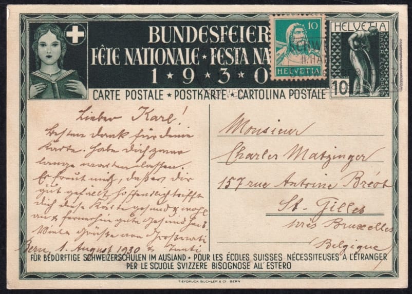 Schweiz Bundesfeierkarten 1930 Augustfeuer, mit Zusatzfrankatur nach Belgien, gestempelt BASEL