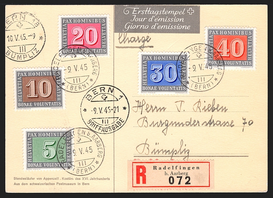 Schweiz, FDC, 1945, PAX, Nr.262-266, R-Karte, FDC, ET-Stempel RADELFINGEN