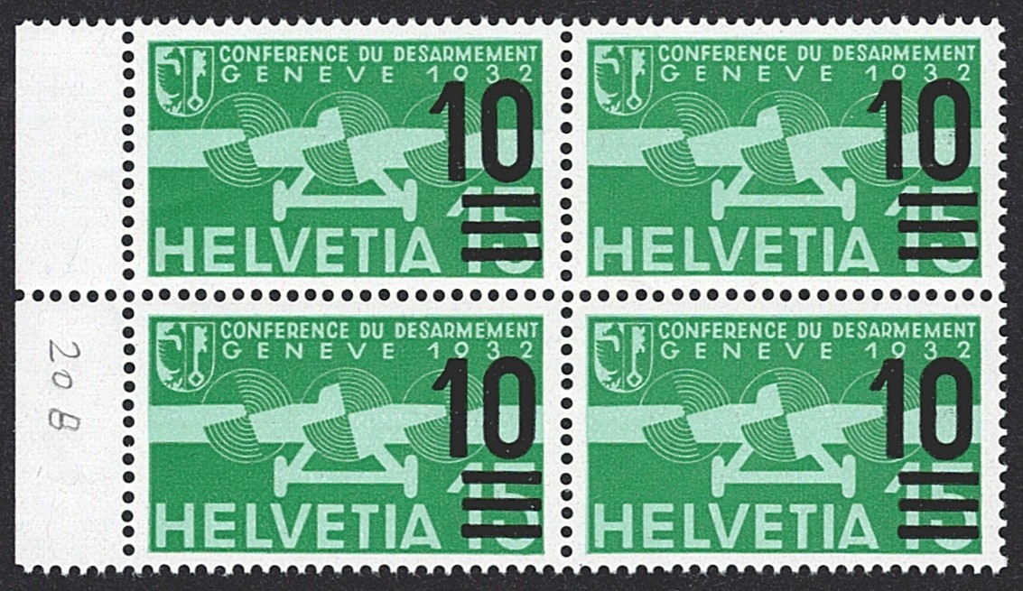Schweiz, Flugpost, Nr.20b, 10/15Rp., grün, Aufdruck matt, im Viererblock