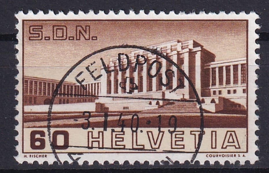 Schweiz, Freimarken 1938, Völkerbundspalast 60 Rp. braun, sauber gestempelt FELDPOST