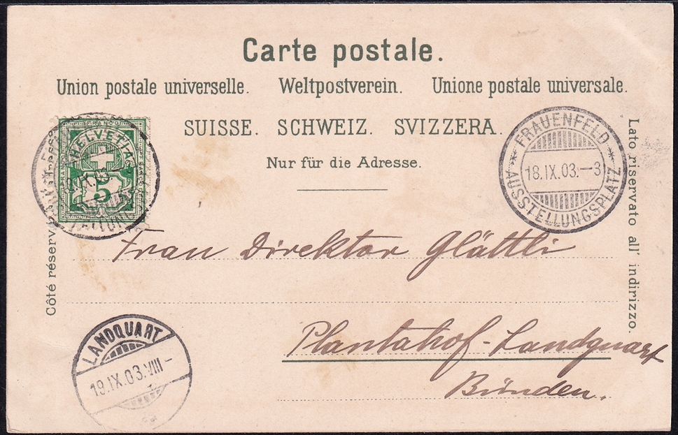 Schweiz, Freimarken, Nr.65B, sauber gestempelt FRAUENFELD AUSSTELLUNGSPLATZ“, auf Karte mit Thurgauer-Wappen