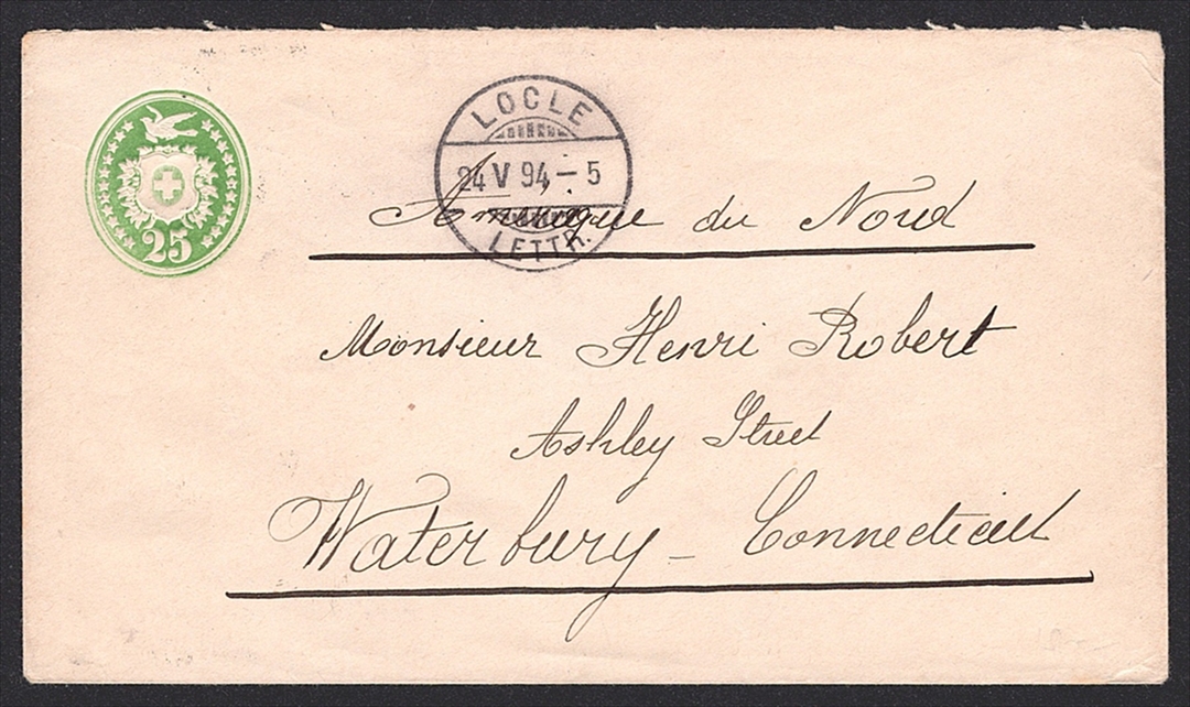 Schweiz, Ganzsachen, Nr.BU 028, LOCLE, nach WATERBURY/USA