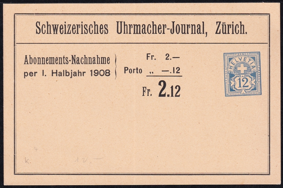 Schweiz, Ganzsachen, Privatganzsachen, PPK 004, 12Rp.blau Ziffermuster,Schweizerisches Uhrmacher-Journal, Zürich