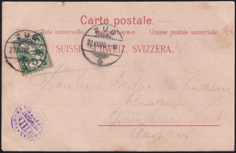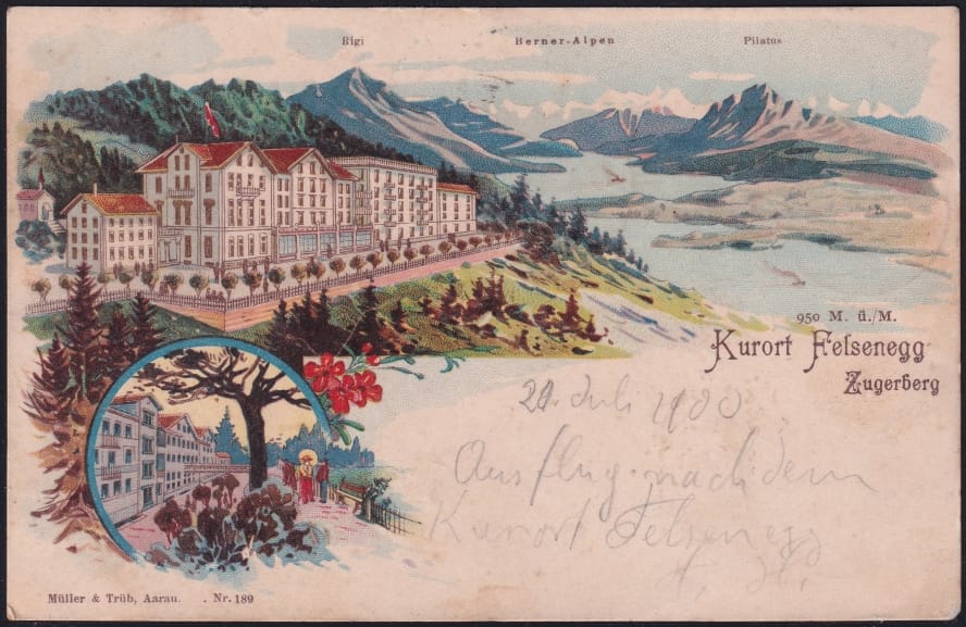 Schweiz Lithographie 1900 „Kurort Felsenegg Zugerberg“ mit Hotel Stempel