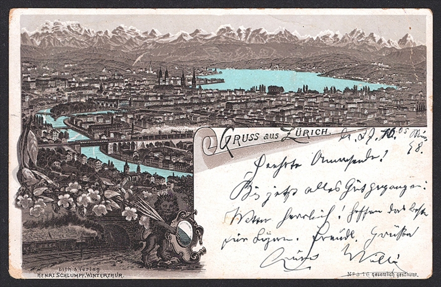 Schweiz, Lithographien, Gruss aus ZÜRICH, 1898, minim bestossen