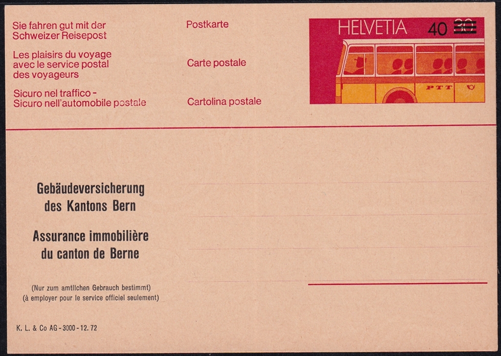 Schweiz, Postkarten, Nr.205, mit Privatzudruck der Brandversicherungsanstalt Bern, ungebraucht