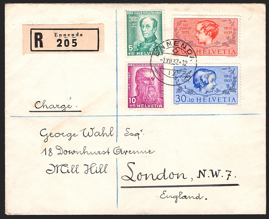 Schweiz Pro Juventute 1937 Serie SBK Nr. J81 bis J84 auf R-Brief nach LONDON gestempelt ENNENDA Ersttag
