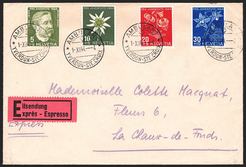 Schweiz Pro Juventute 1944 Serie SBK Nr. J109 bis J112 auf Express Brief gestempelt Ersttag
