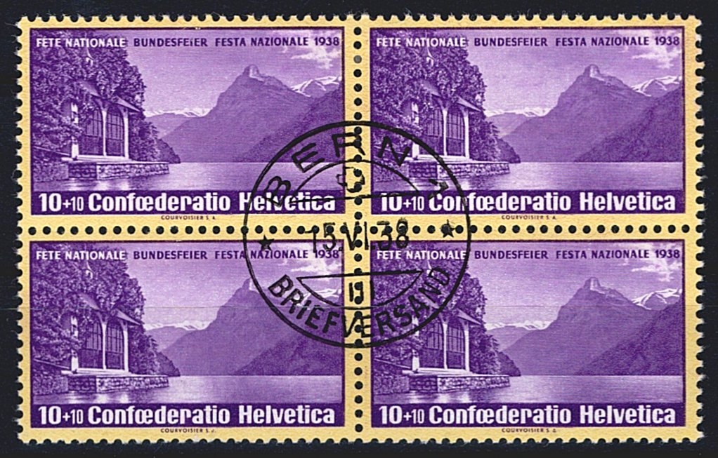 Schweiz, Pro Patria, Tellsapelle, Nr.1y, glattes Papier, im Viererblock, ET-Stempel BERN
