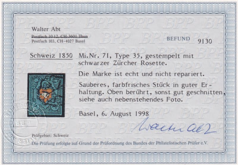 SBK Nr. 15 I mit Kreuzeinfassung Type 35 gestempelt mit schwarzer Zürcher Rosette
