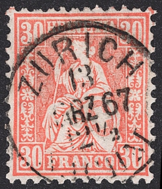 Schweiz, Sitzende Helvetia, Nr.33, 30Rp.zinnober, Vollstempel ZÜRICH
