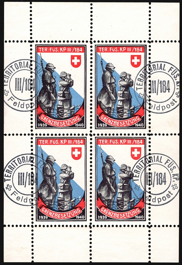 Schweiz, Soldatenmarken, Territorial-Truppen, Ter.Kp.III/184, Nr.384, gezähnter Block, 4 passende Truppenstempel