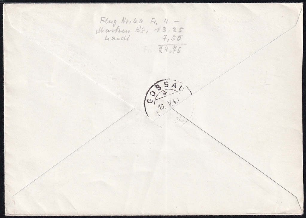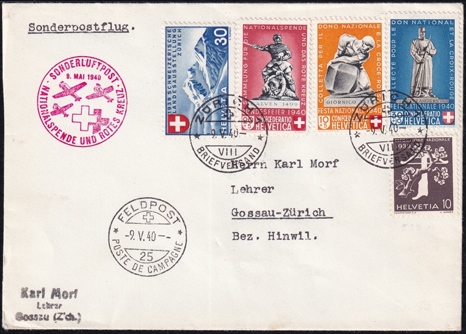 Schweiz, Sonderflüge zu Gunsten des Roten Kreuzes, 1940, ab Zürich in die Feldpost 25, SF40.2a, portogerecht, beförderte Sendungen 1’510, frankiert u.a. mit BF Nr.5c